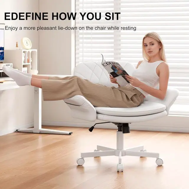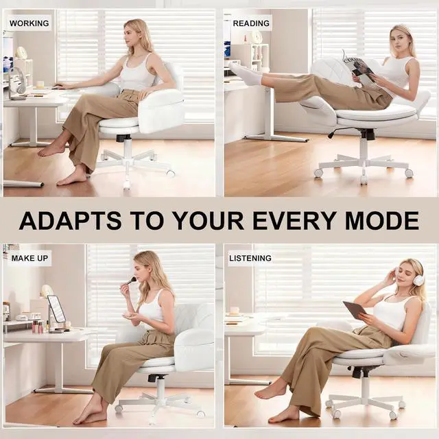 Misolant Criss Cross Chair with Armrests & Wheels for Cross-Legged Sitting, Comfortable PU Leather Vanity Chair, Office Desk Chairs with Adjustable Rocking Function, for Home, Bedroom White