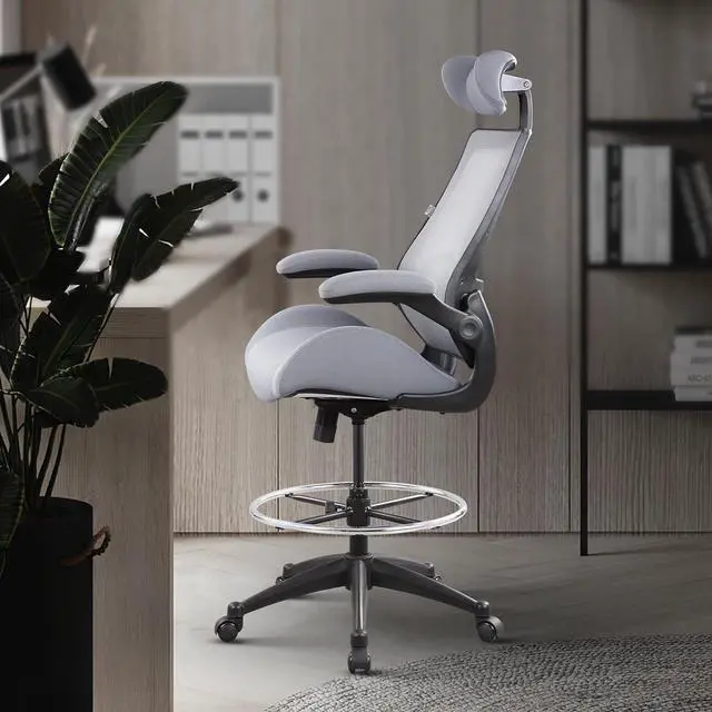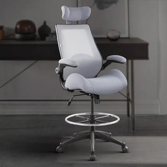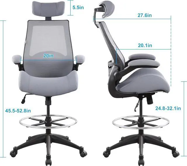 Drafting Chair With Headrest: Use for long-time working people. 3D designed headrest with height adjustable foot ring.The 90-degree flipped arms can save indoor space, suitable for stand-working,sit-working,bar,Café and so on.With a oversize foot ring helps you swivel 360 degree, reduce the pressure on the legs and increase the comfort of the back and buttocks.