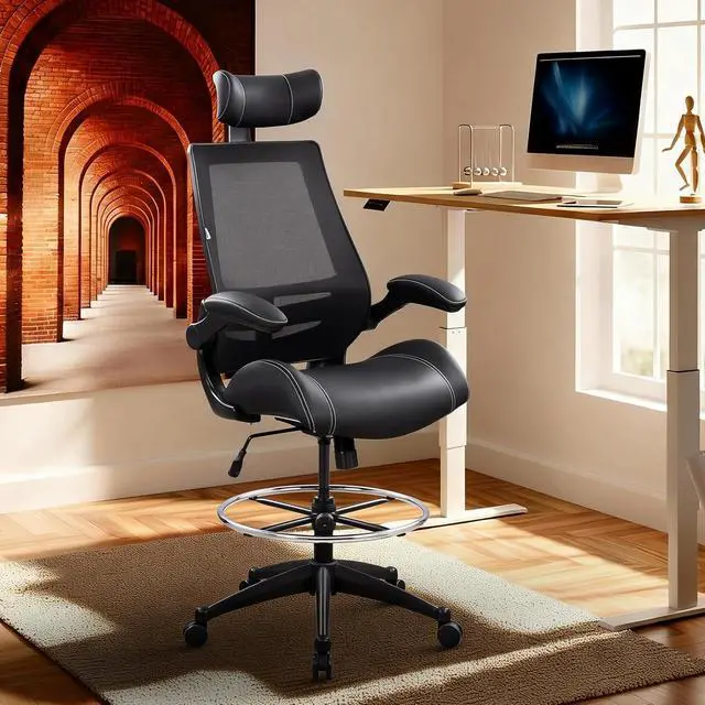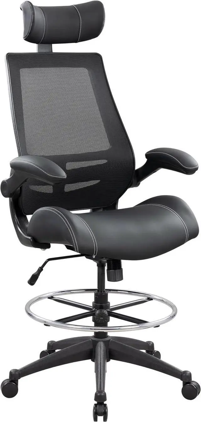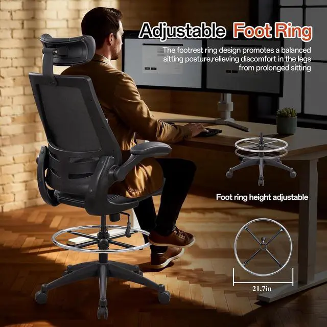 Drafting Chair With Headrest: Use for long-time working people. 3D designed headrest with height adjustable foot ring.The 90-degree flipped arms can save indoor space, suitable for stand-working,sit-working,bar,Café and so on.With a oversize foot ring helps you swivel 360 degree, reduce the pressure on the legs and increase the comfort of the back and buttocks.