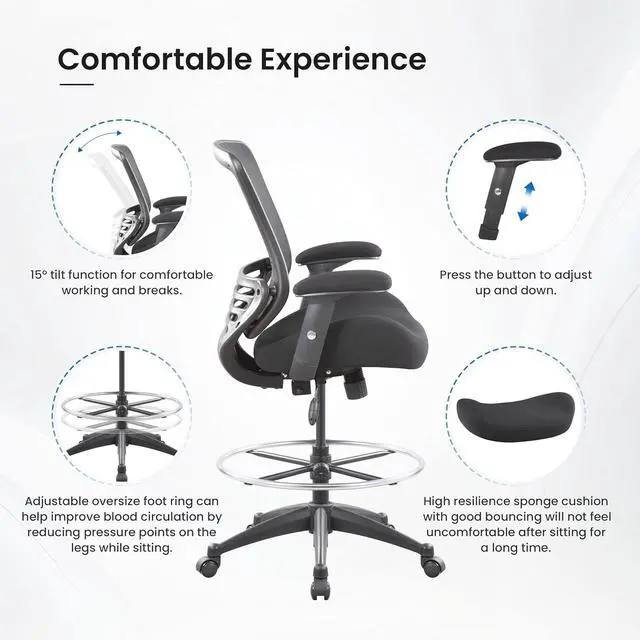 Function:You can put your feet on the 24.016 inch bigger foot ring when you seat on the chair.Oversize feet ring is bigger than the seat,it will be easy to put your foot on the foot ring.Using our drafting chair does not cause bending of the feet or stress on the legs.When you work in a chair for a long time ,your legs will be very comfortable and there will be no pressure on your feet.