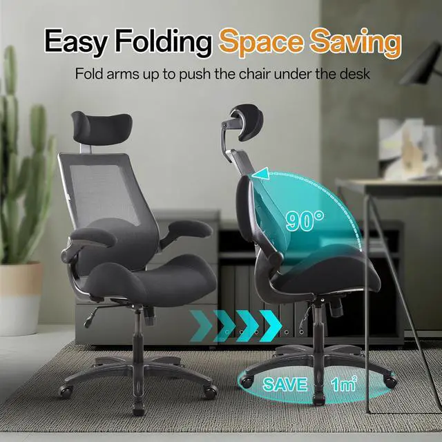 SPACE-SAVING FOLDABLE BACKREST DESIGN Reclaim your living space with our unique folding mechanism. Unlike standard bulky office chairs, the arm flip up 90 degrees, allowing you to slide the chair completely under your desk. This is the ultimate solution for home offices, small apartments, dorms, or studios where maximizing floor space is essential.