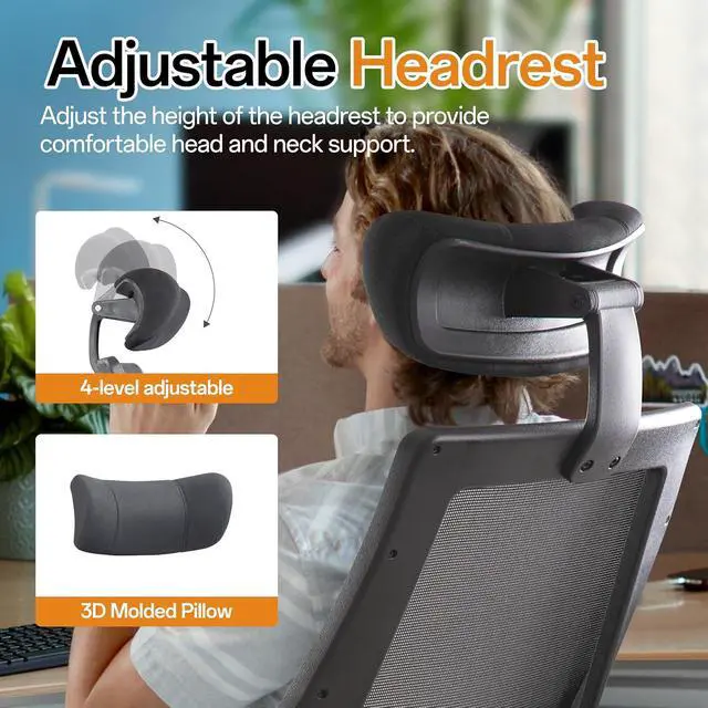 ERGONOMIC 3D ADJUSTABLE HEADREST Experience targeted neck relief with the upgraded 3D molded foam headrest. It features 4-level height adjustability and a curved design that perfectly cradles your cervical spine. Whether you are sitting upright to focus or leaning back to relax, the headrest adjusts to reduce neck strain and shoulder tension.