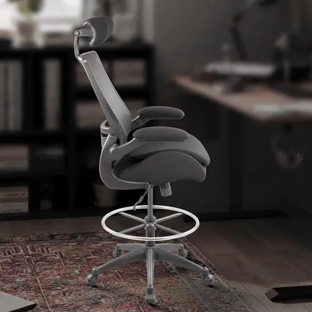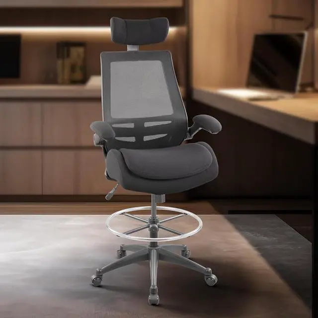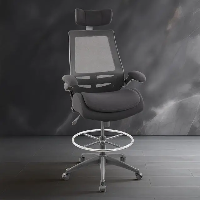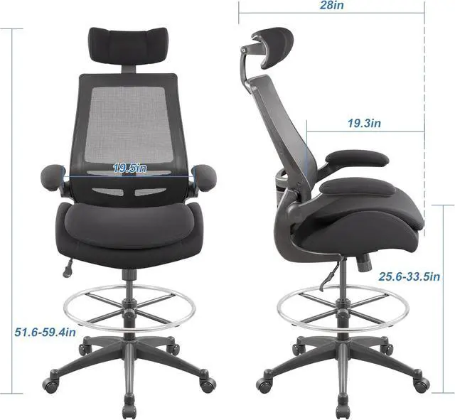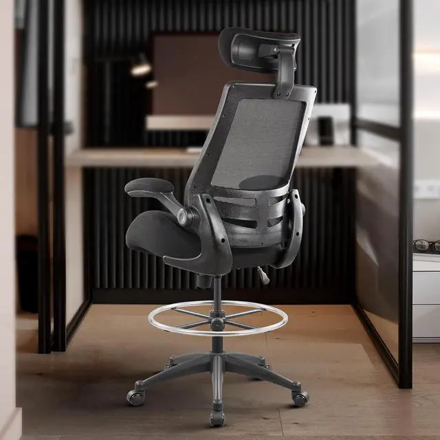 Drafting Chair With Headrest: 3D designed headrest with height adjustable foot ring.The 90-degree flipped arms can save indoor space, suitable for stand-working,sit-working,bar,Café and so on.With a oversize foot ring helps you swivel 360 degree, reduce the pressure on the legs and increase the comfort of the back and buttocks.