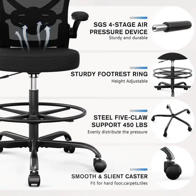 Alolo Drafting Chair,Big and Tall Office Chair with Footrest Ring,Ergonomic Chair for Counter Height and Standing Desk Comfy with Lumbar Support and Flip-up Armrests in Heavy Rolling Base,Black