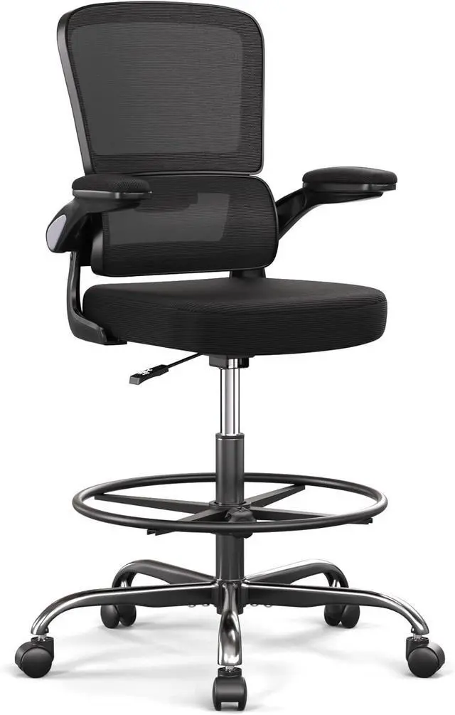 Ergonomic Drafting Chair with Footrest,Tall Office Chair for Standing Desk with Flip-up Armrests with Breathable Comfy Mesh Support and Adjustable Foot Rest Ring(Black)