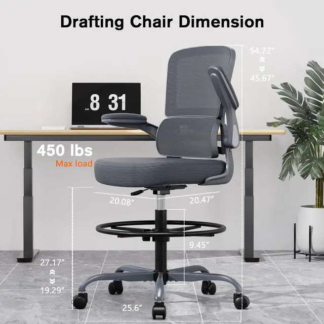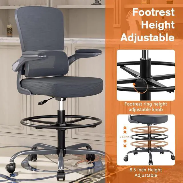 Alolo 450lbs Ergonomic Drafting Chair,Tall Office Chair with Footrest Ring,Breathable Office Chair for Standing Desk with Lumbar Support and Flip-up Armrests in Heavy Rolling Base for Office,Grey