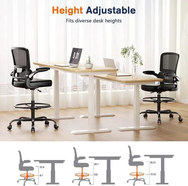 Comfy Desk Stool: This tall office chair for standing desk features a breathable mesh backrest made of flexible polyester material, offering comfort and support to reduce discomfort from long periods of sitting. When paired with a height-adjustable desk, it serves as a standing desk chair, and the big and tall office chairensures stability while allowing your legs to rest comfortably.