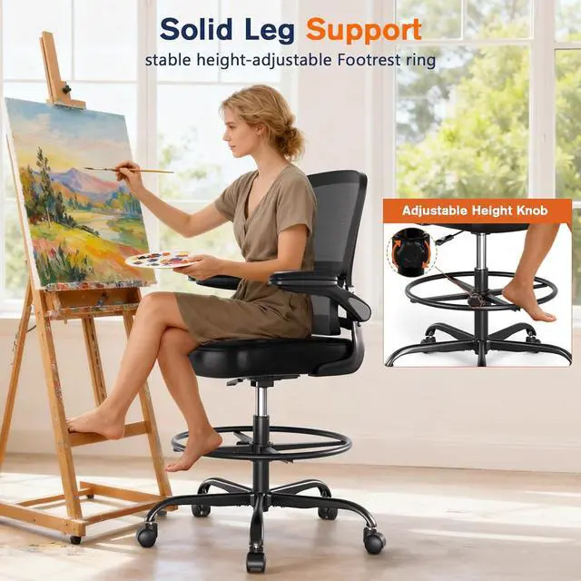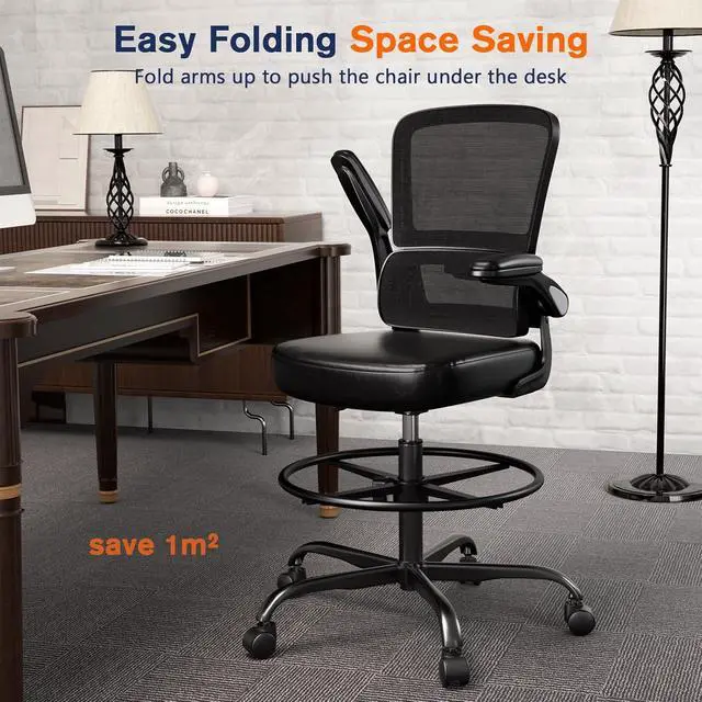 Alolo 450lbs Ergonomic Drafting Chair with Flip-up Armrests,Tall Office Chair with Adjustable Footrest Ring for Home Office,Leather Office Chair with Lumbar Support for Counter Height Desk (PU)