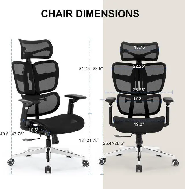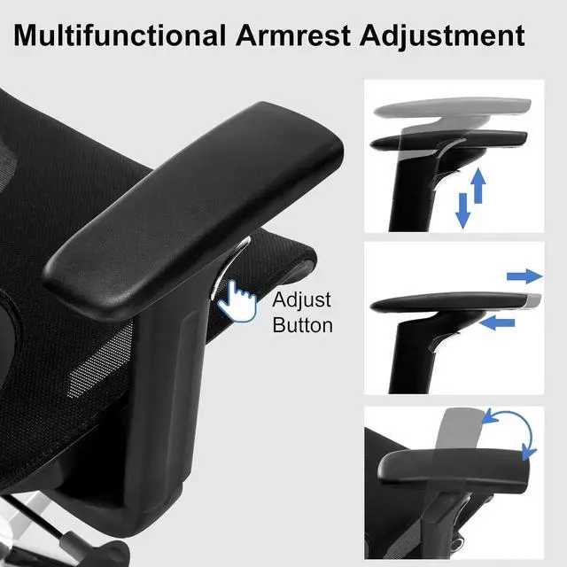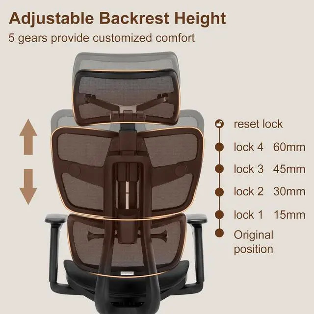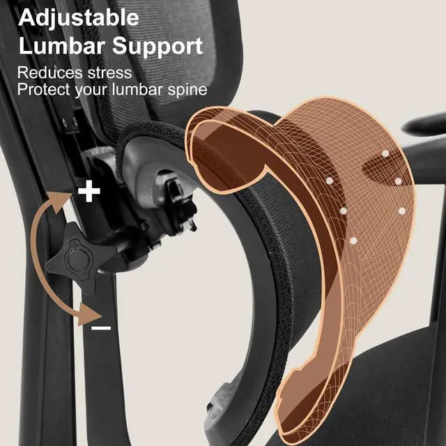 Ergonomic Lumbar Support and BackrestAdjustable 3D lumbar support helps you maintain good posture, protect your lumbar spine and relieve pain. The S-curved backrest fits your back perfectly, and butterfly bionic dual frame design for more huggable support. Backrest height can be adjusted and locked in 4 additional gears for optimal comfort, and to suit different body types.