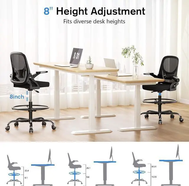 Adjustable Drafting Chair:This office drafting chairs come with a wide 20" footrest ring, providing a comfortable resting space for your feet. The foot ring is 8" adjustable in height, allowing you to lock it securely at your preferred height without it slipping off.