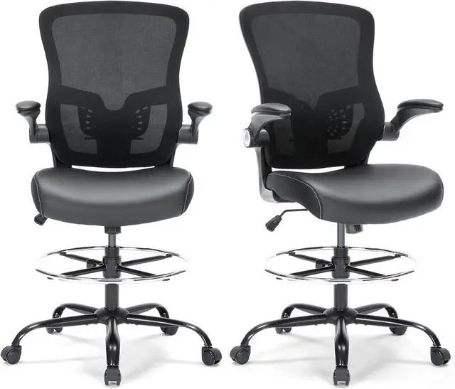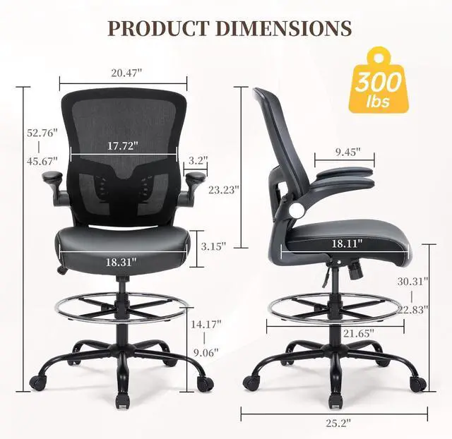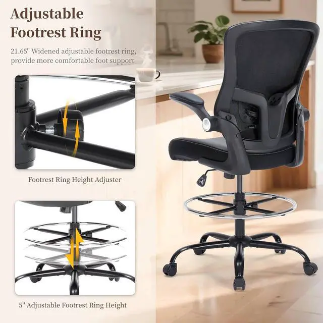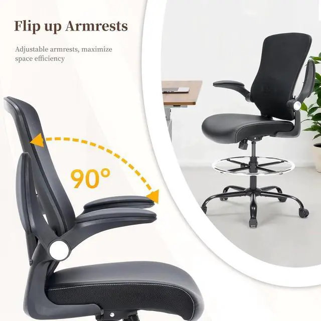 Adjustable Tall Office Chair: This drafting chair features 90° flip-up armrest, which can save a certain amount of space; Adjustable seat height from 22.83-30.31 inches, very suitable for standing desks, sitting desks and bars; It also has 90°-120° rocking mode and 360° rotation caster