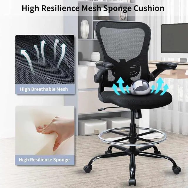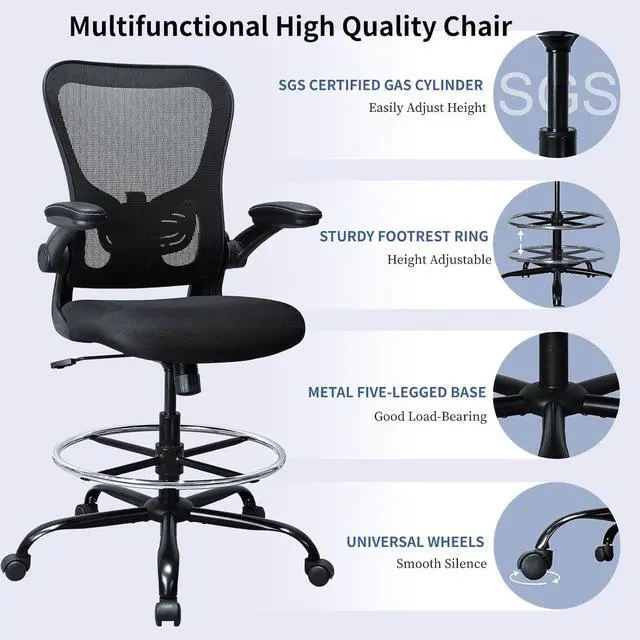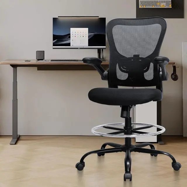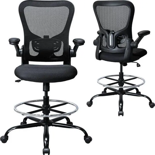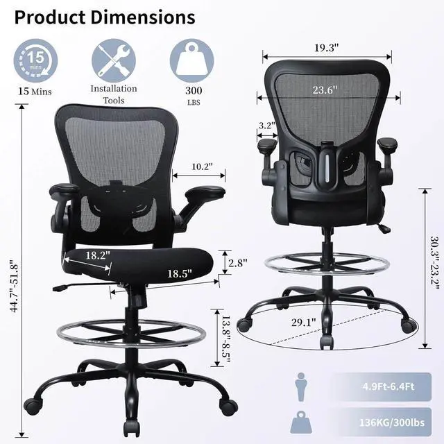 Adjustable Height & Footrest Ring: Our drafting chair can be adjusted by 18cm/7 inches in height to meet different heights and needs; Equipped with a 21.65 inches round foot ring can help you move your feet more frequently, reduce the pressure on the back of your legs and improve comfort; The 90° flip armrest design can save some space.