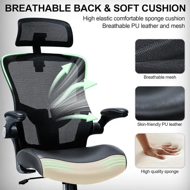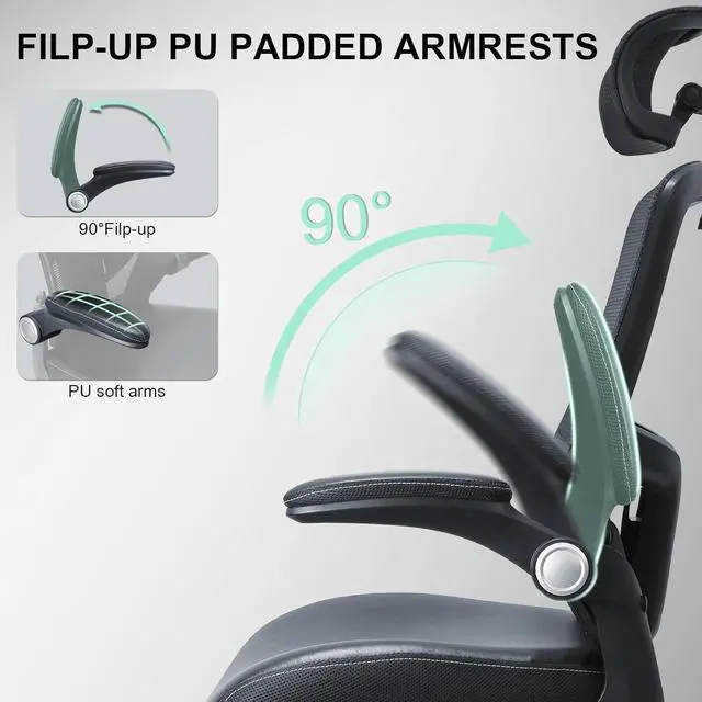 Ergonomic Office Chair,High Back Mesh Desk Chair with Adjustable Lumbar Support & Headrest Home Office Computer Swivel Executive Task Chair with Flip-Up Armrests (Black)