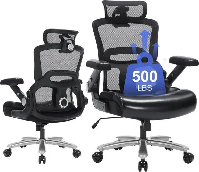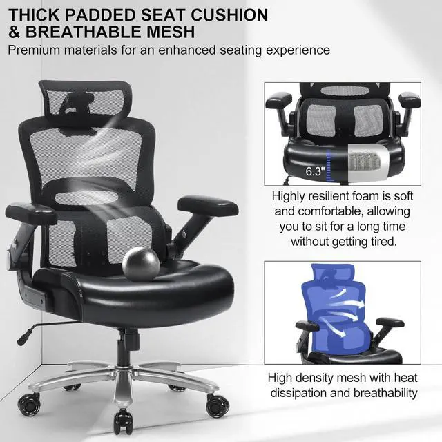 500lbs Heavy Duty Ergonomic Office Chair, Big and Tall Desk Chair with Adjustable Lumbar Support 3D Flip Arms Headrest, Mesh High Back Wide Computer Executive Chair for Heavy People