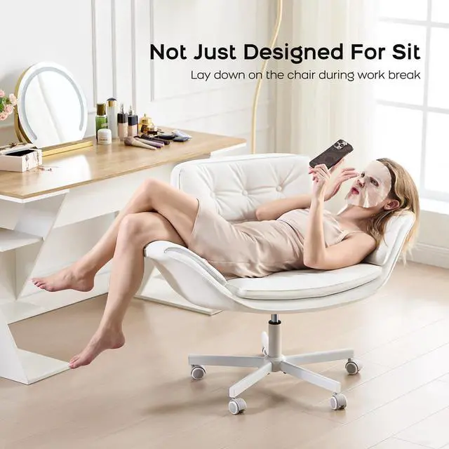 Criss Cross Chair with Armrests & Wheels, PU Leather Vanity Chair, Comfortable Adjustable Swivel Computer Office Desk Chairs for Home, Make Up, Bed Room (White)
