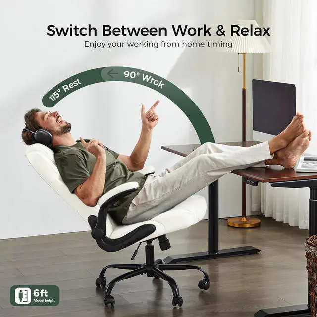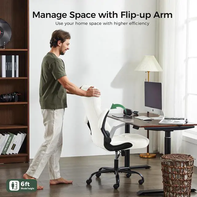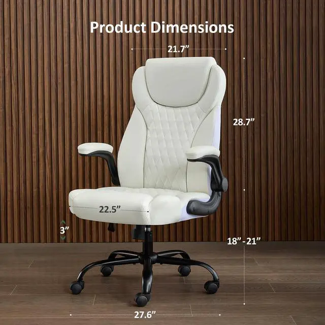 Office Chair, Executive PU Leather Chair Home Office Desk Chairs, Ergonomic Computer Desk Chair with Adjustable Flip-Up Arms, Lumbar Support Swivel Task Chair with Rocking Function (White)