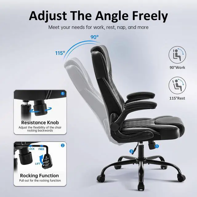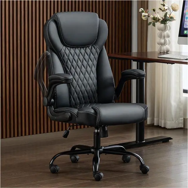 Office Chair, Executive PU Leather Chair Home Office Desk Chairs, Ergonomic Computer Desk Chair with Adjustable Flip-Up Arms, Lumbar Support Swivel Task Chair with Rocking Function (Black)