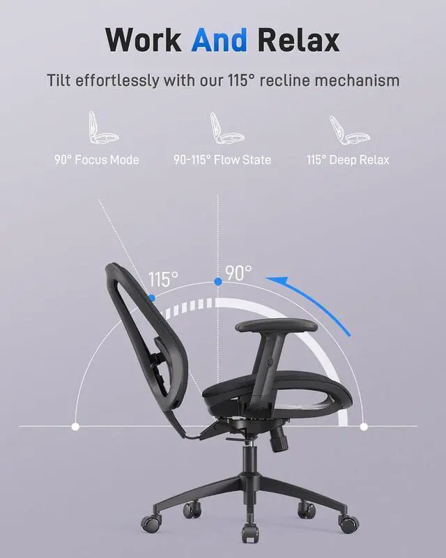 Adjustable Comfort: This mesh desk chair offers 5 adjustable parts: headrest and lumbar support (up/down), seat height, armrest height, and a 90115° rocking tilt. Personalize your sitting position to stay comfortable through every task