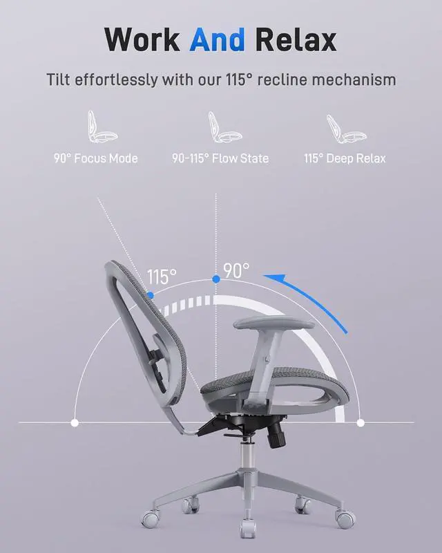 Adjustable Comfort: This mesh desk chair offers 5 adjustable parts: headrest and lumbar support (up/down), seat height, armrest height, and a 90115° rocking tilt. Personalize your sitting position to stay comfortable through every task