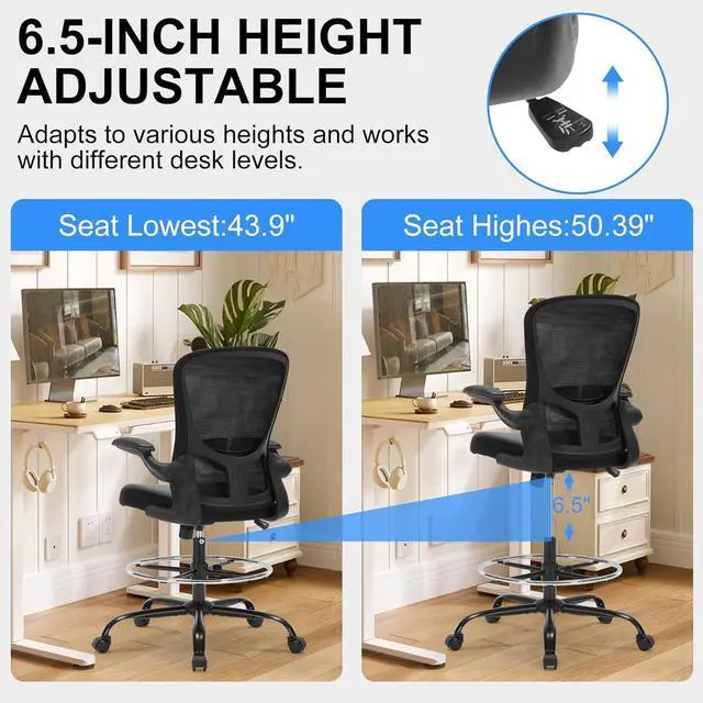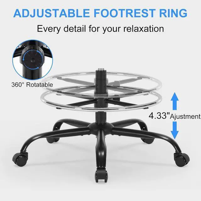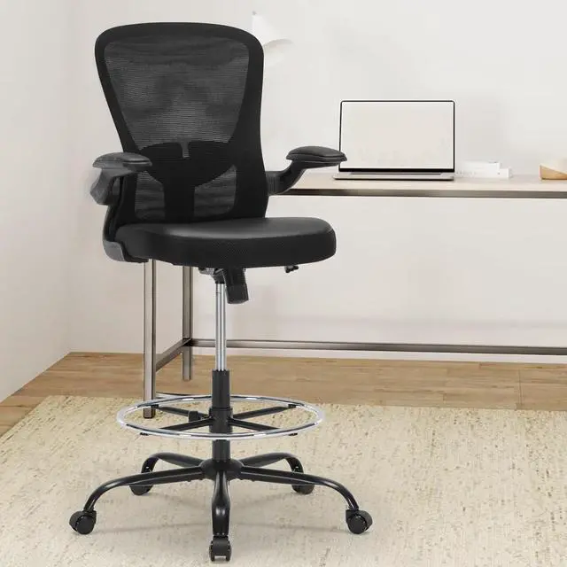 Adjustable Tall Office ChairThe seat height can be adjusted from 23.23" to 29.92", making it a perfect fit for various standing desks. It also features a 21.56" wide footrest ring with a 4.33" adjustable height range, allowing you to securely lock it at your preferred level for stable and comfortable foot support. The chair comes with 90° flip-up PU leather padded armrests that provide excellent arm support and can be conveniently folded up to slide the chair neatly under your desk, saving space when not in use.