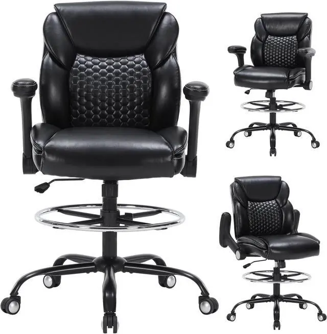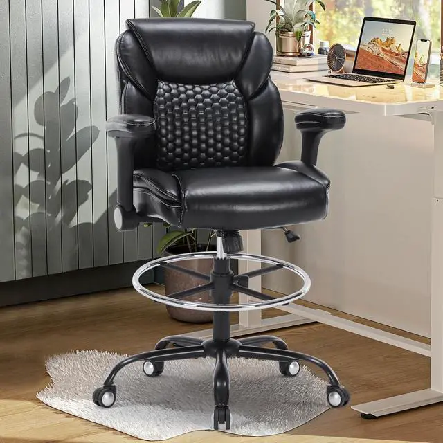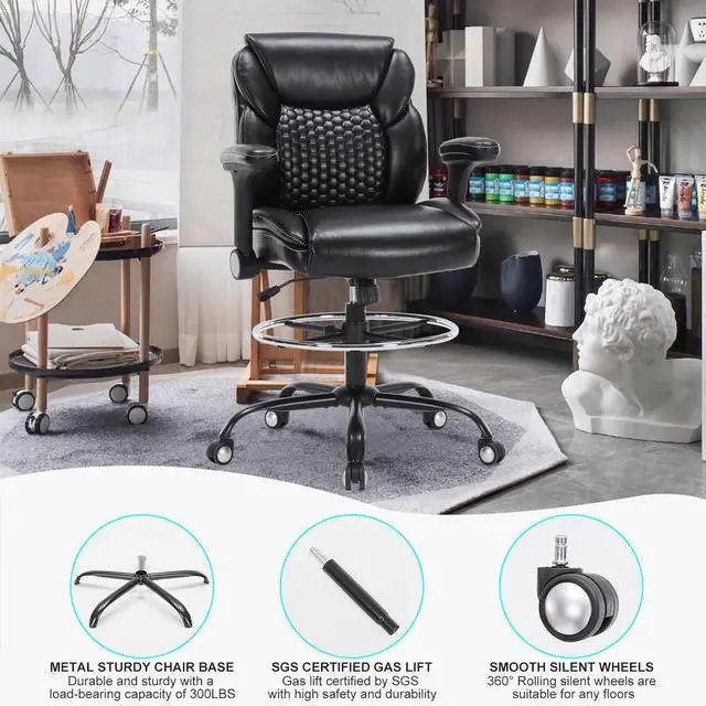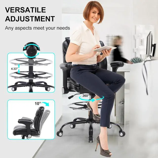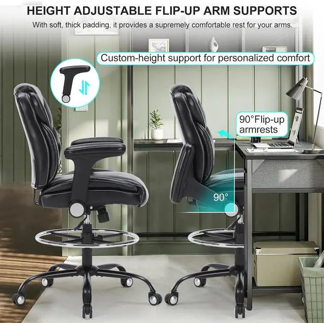 Versatile AdjustabilityThis high desk chair is equipped with reversible and height adjustable armrests. Flipping up the armrest allows the chair to be stored under the desk to save space, and can be adjusted according to different needs. The tall office chair is also equipped with foot ring, and the height can be adjusted from 7.48- 11.81. The seat height can also be adjusted from 24.41 -31.89 to accommodate different heights of sitting posture, providing excellent support for you to maintain the best posture and comfort while working.