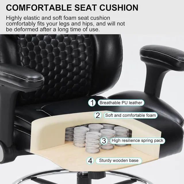 Premium Comfort & DurabilityThis standing desk chair features high-grade PU leather that combines skin-friendly breathability with exceptional scratch resistance for easy maintenance. The waterfall-edge seat utilizes dual-layer high-resilience foam cushioning - offering cloud-like softness while preventing deformation, delivering superior thigh pressure relief and lasting comfort for extended sitting sessions.