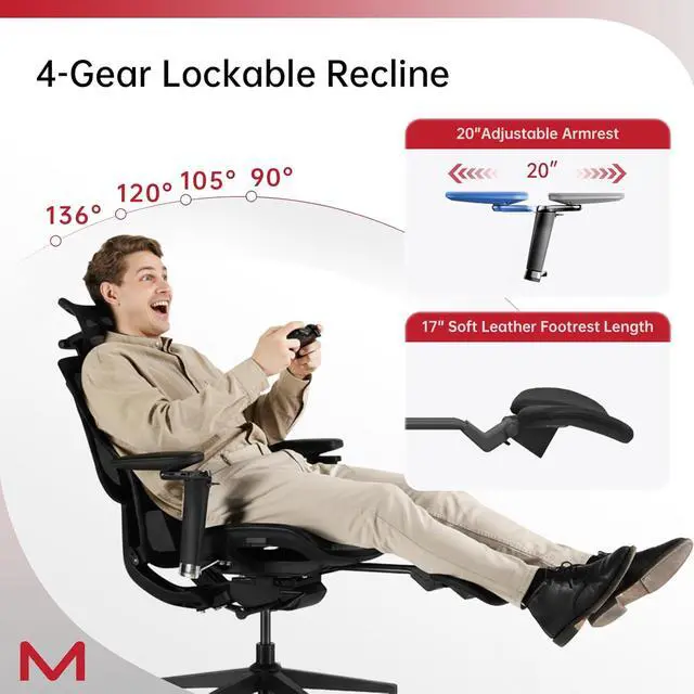 136° Lockable Recline with FootrestThis ergonomic office chair offers a 136° recline with 4-level locks so you can lie fully in one second. Unfold the 17" retractable footrest to extend legs, relieve lumbar & knee pressure and boost circulation; the stable steel chassis keeps you safe at any angle.