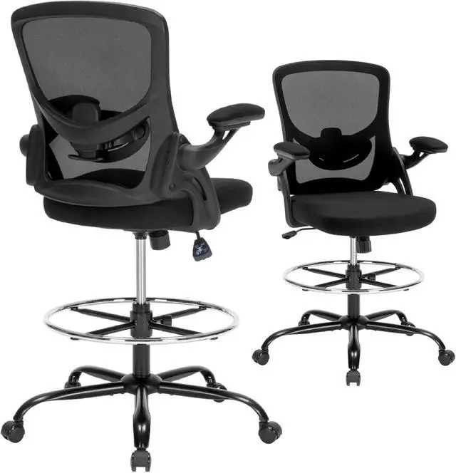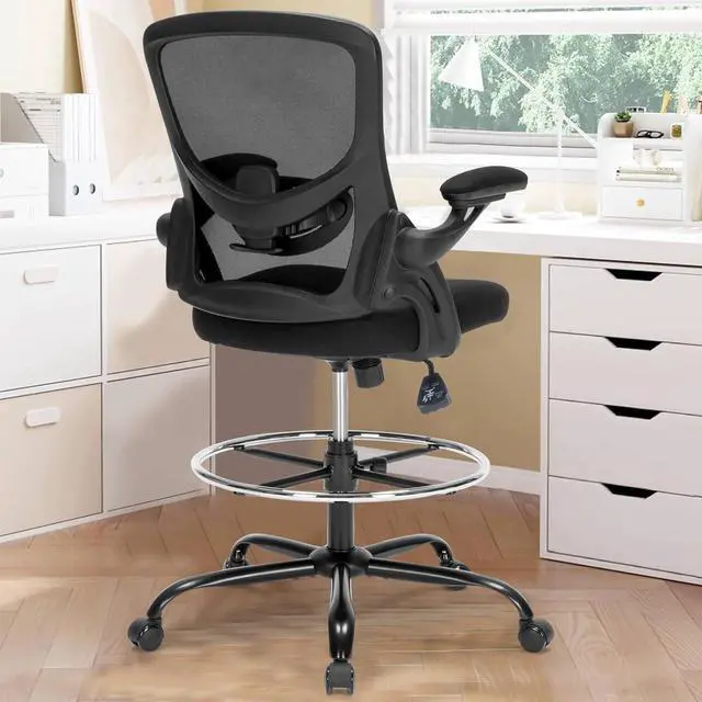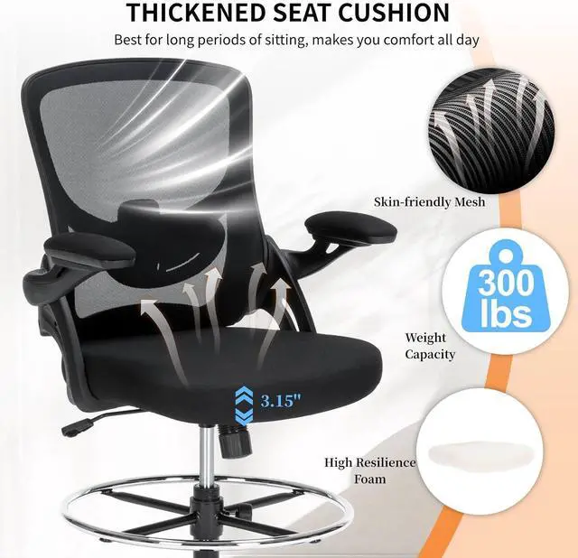 Drafting Chair, Tall Office Chair for Standing Desk, Ergonomic Standing Desk Chair with Flip-up Armrests, Counter Height Office Chair with Footrest and Adjustable Lumbar Support
