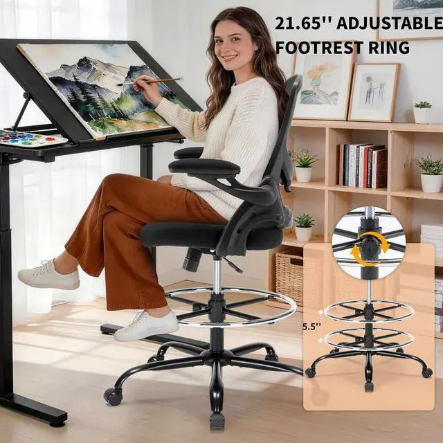 21.65'' Widened Footrest Ring: 21.65'' wide footrest ring is 20% wider than the footrest ring of other drafting chairs on the market, giving the foot a larger area of support, help you move your feet more frequently, reduce the pressure on the back of your legs and improve comfort. The 5.5" adjustable height is suitable for people of different heights, providing the most suitable support for the foot