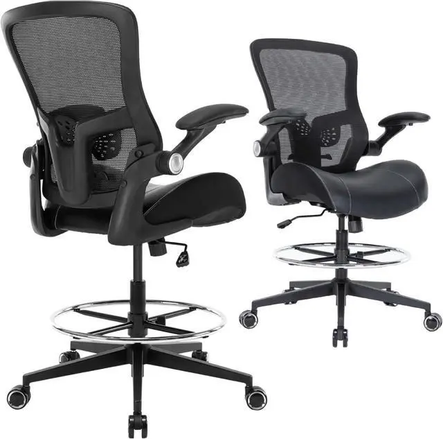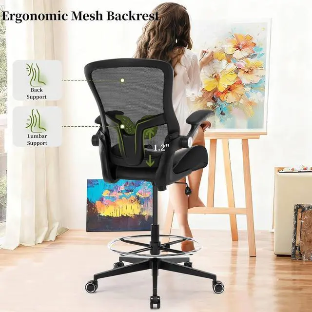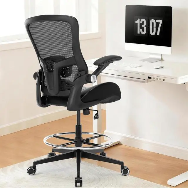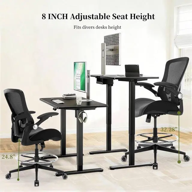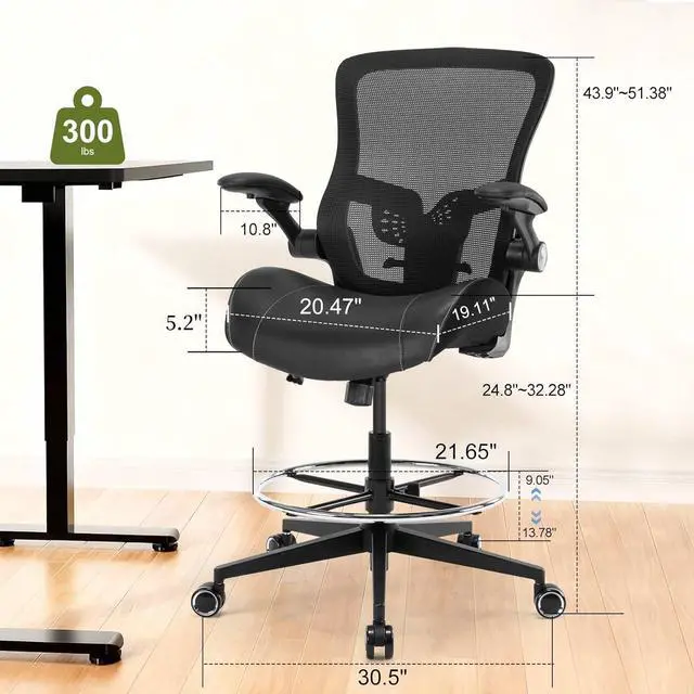 Adjustable Drafting Office Chair: This swivel drafting office chair is designed with a 5.5'' height adjustable footrest ring, help you move your feet more frequently, reduce the pressure on the back of your legs and improve comfort, adjustable seat height of 24.8-32.28 inches, flip up armrests can save a certain amount of space, which is very suitable for standing desks, sitting desks and bars table