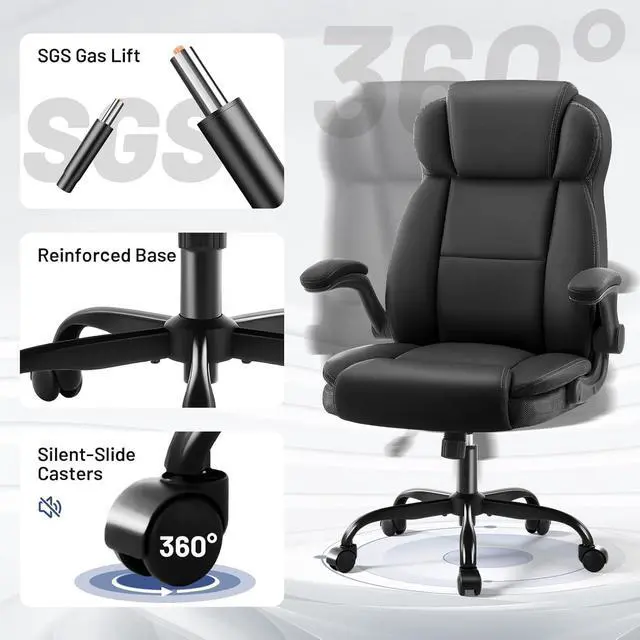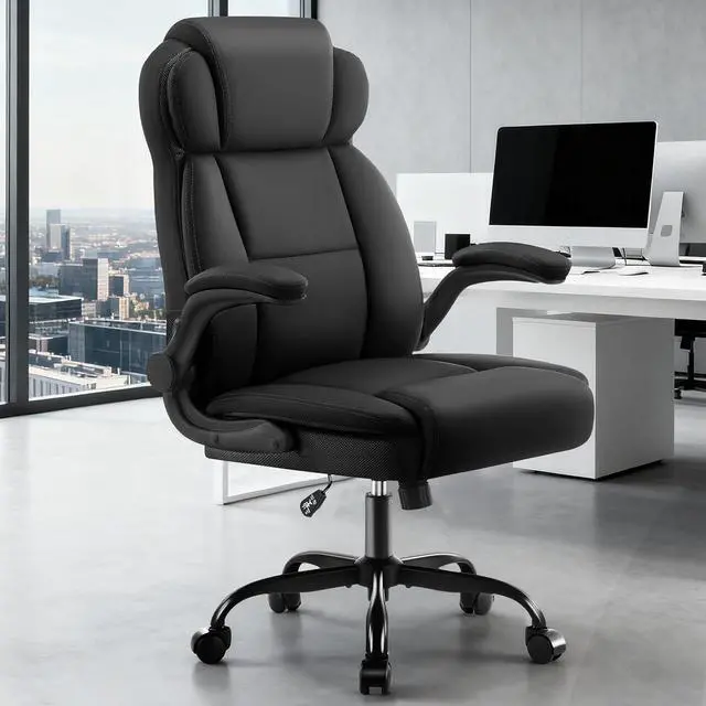 Ergonomic Office Chair with High Back Headrest, PU Leather Executive Desk Chair - Padded Flip-Up Armrests, Lumbar Support, Swivel Computer Chair for Home Office & Gaming, Black