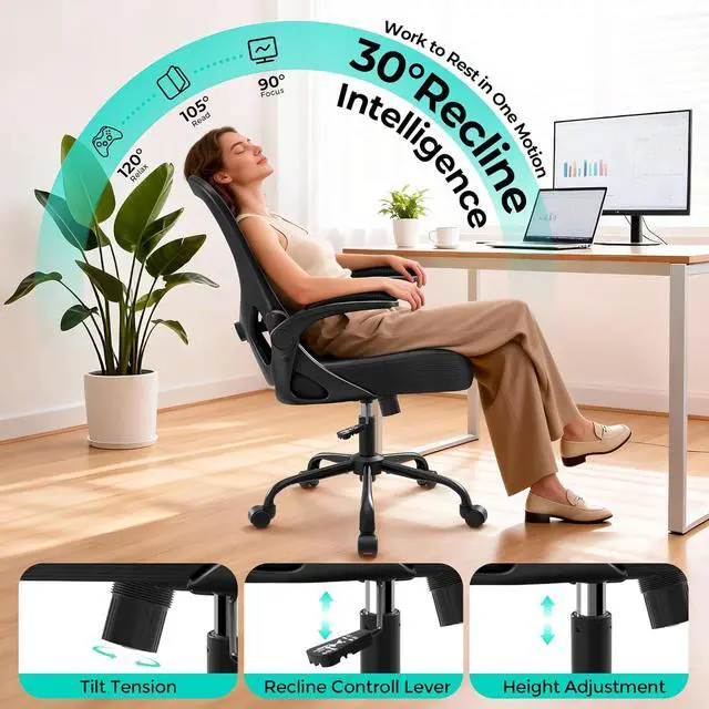 Office Chair - Ergonomic Breathable Mesh Desk Chair with Adjustable Lumbar Support and Flip-up Armrests - Executive High Back Rolling Swivel Comfortable Computer Gaming Chair for Home Office Black