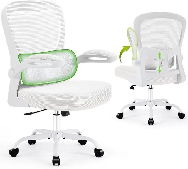 Ergonomic Office Chair, Comfy Desk Chair with Adjustable Lumbar Support, Mesh Computer Chair with Wheels, Flip-up Armrests, Swivel Rolling Executive Chair for Home Office, Gaming, White