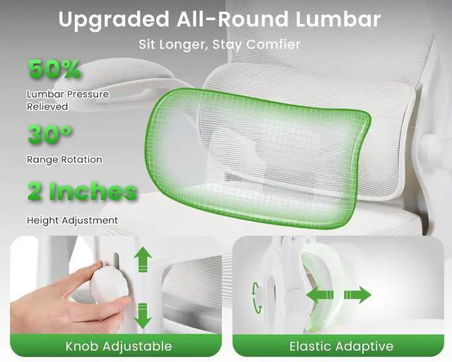 Engineered Ergonomic Support: Experience enhanced comfort with targeted support for head, shoulders, back, hips, and hands. Proper adjustable lumbar support promotes healthy posture, reducing pressure during long work sessions at your ergonomic desk chair