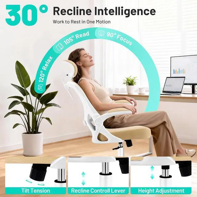 Dynamic Posture Intelligence: The advanced 2D adjustable headrest of the computer chair offers both vertical and angle adjustment, cradling your head and neck in optimal alignment to maintain the natural curvature of your spine. Move seamlessly between focused tasks and relaxed moments. Adjust from an upright 90° for concentrated work to a 120° recline for short breaks or casual reading. Ideal for Zoom meetings, quick power naps, or creative brainstorming