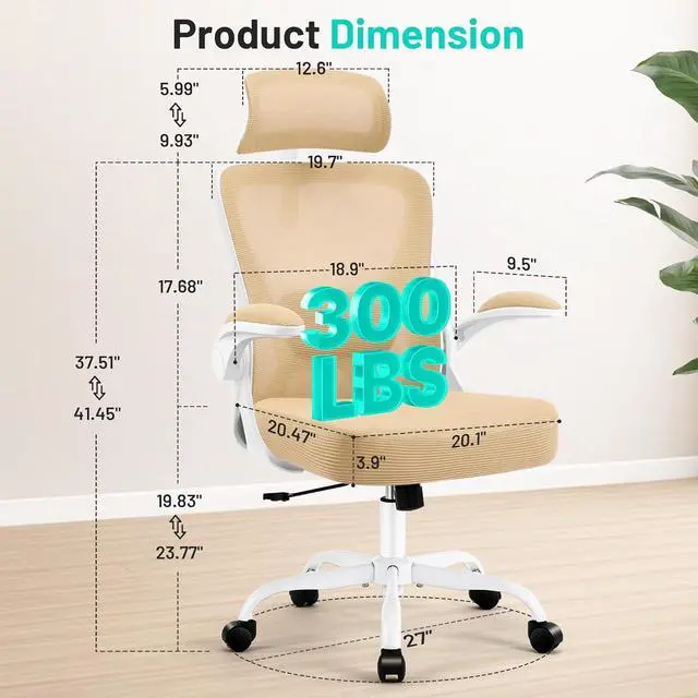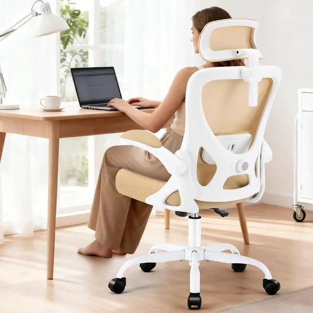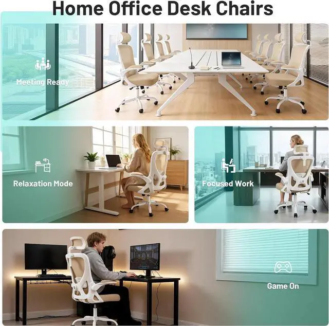 Office Chair - Ergonomic Desk Chair Breathable Mesh Chair with 2D Headrest & Adjustable Lumbar Support - Executive High Back Rolling Swivel Computer Gaming Chair with Wheels Flip-up Armrests Khaki