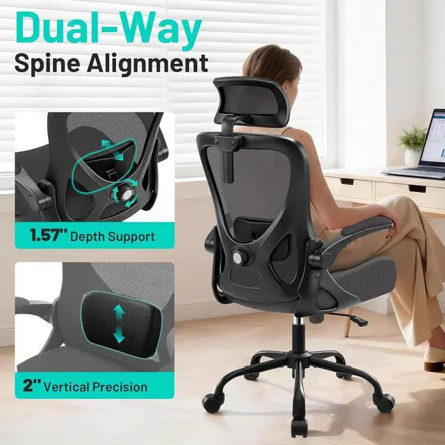 Office Chair - Ergonomic Desk Chair Breathable Mesh Chair with 2D Headrest & Adjustable Lumbar Support - Executive High Back Rolling Swivel Computer Gaming Chair with Wheels Flip-up Armrests Dark Gray