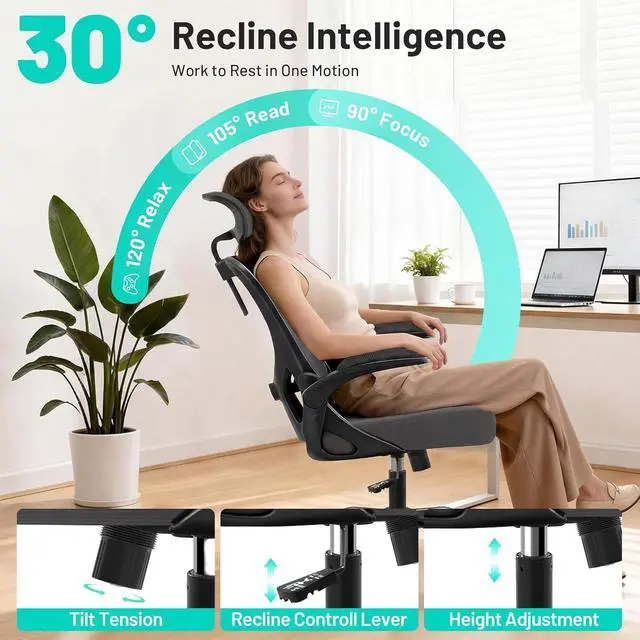 Dynamic Posture Intelligence: The advanced 2D adjustable headrest of the computer chair offers both vertical and angle adjustment, cradling your head and neck in optimal alignment to maintain the natural curvature of your spine. Move seamlessly between focused tasks and relaxed moments. Adjust from an upright 90° for concentrated work to a 120° recline for short breaks or casual reading. Ideal for Zoom meetings, quick power naps, or creative brainstorming