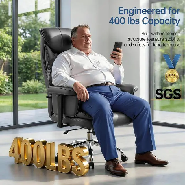 Heavy-Duty & Durability Construction: Our office chair is built to last with a reinforced metal base that supports up to 400 lbs, accommodating larger frames with confidence. The SGS-certified Class-3 gas lift offers a generous 100mm height range, while the waterproof, scratch-defence PU leather wipes clean in secondsmaking it a practical choice for busy professionals, shared workspaces, and homes with pets