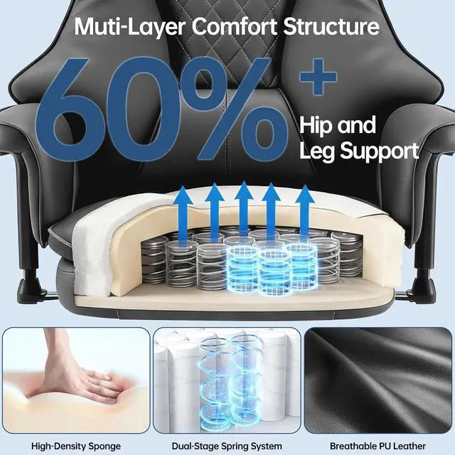 Pressure-Relieving Seating: Rediscover comfort with our scientifically engineered seat. Featuring 24 individual pocket springs layered in high-density sponge, our desk chair's seat enhances breathability and dynamic support while reducing thigh pressure by up to 60%. The height-adjustable, padded armrests further ease strain on your shoulders and arms, making it optimal for extended workdays, intense gaming, or anyone seeking lasting relief from seated fatigue