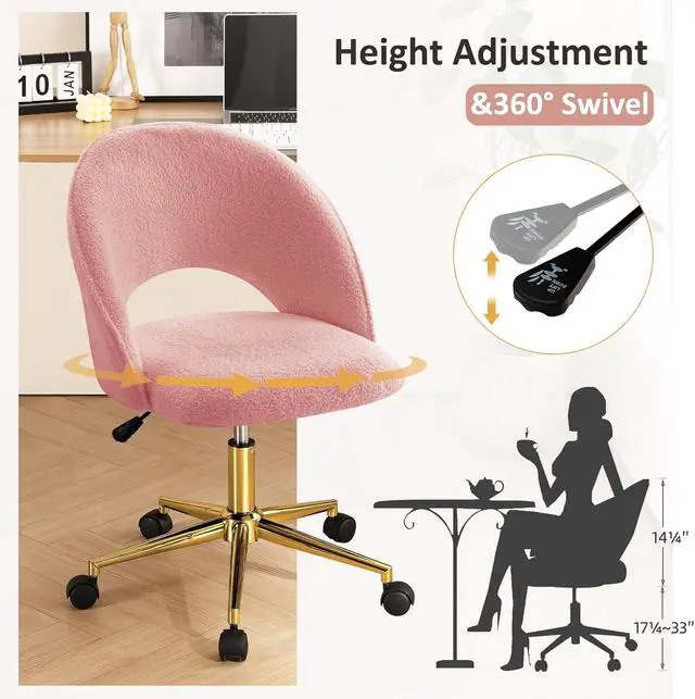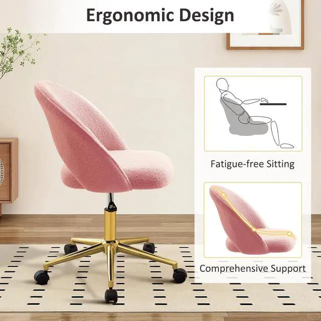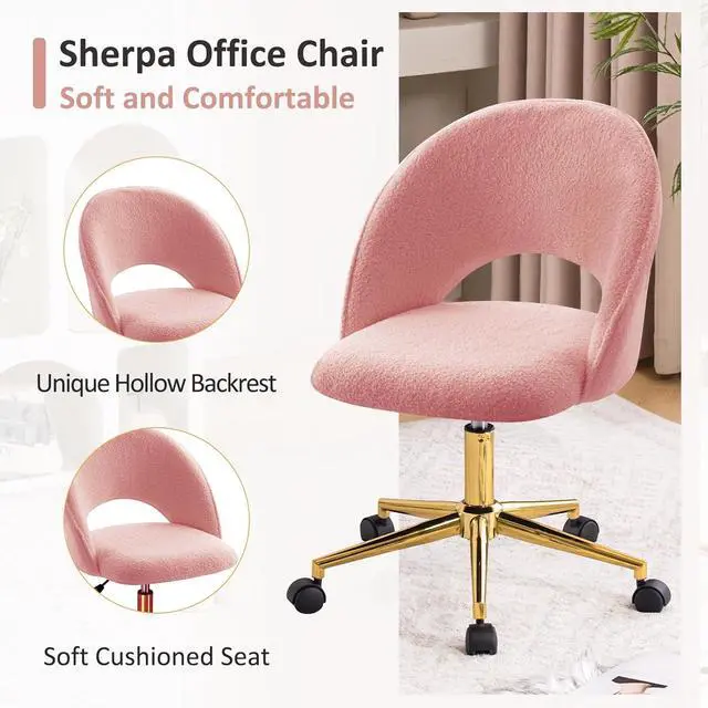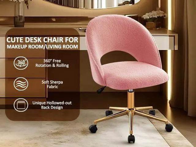 Furniliving Vanity Desk Chair with Wheels, Cute Office Chair with Back for Girls, Rolling Upholstered Armless Desk Chair with Gold Metal for Living Room Makeup Room Bedroom, Pink-Sherpa