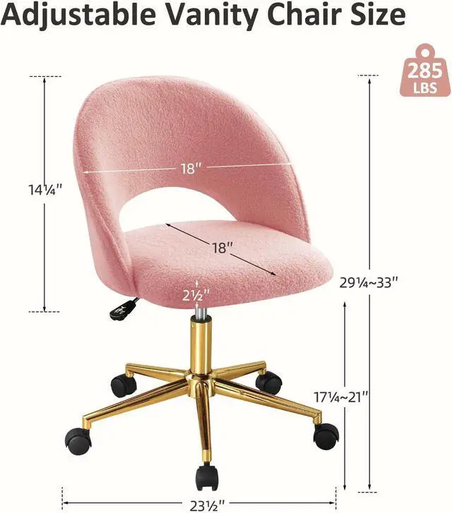 Stable BaseGold metal base is no fading, no rust and rubber castor effective protection of the floor. You can move our upholstered office chair freely in different rooms without noise.Weight capacity 285 lbs. Seat Dimensions: 23.5" W X 23.5" D; Back Dimensions: 18" W X 14.25" H; Seat Height: 15"-18.75"; Total Height: 29.25"-33"; Maximum Load: 285 LBS.