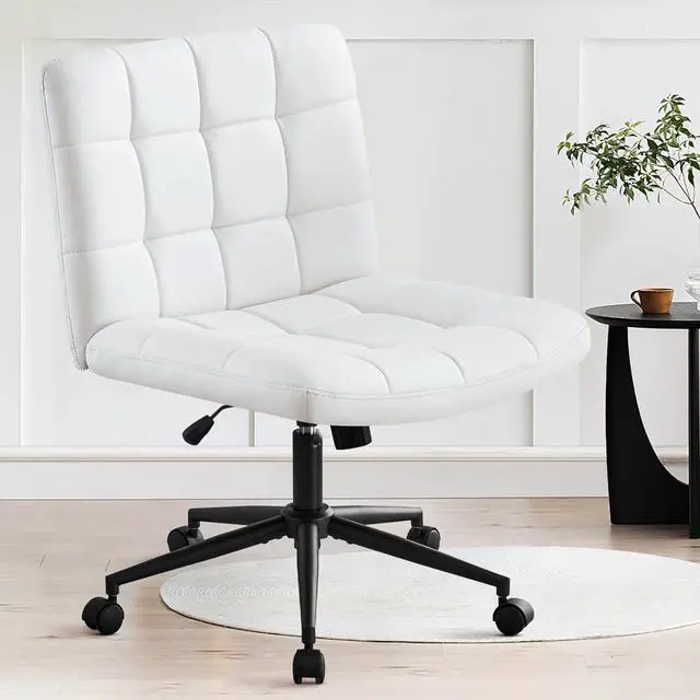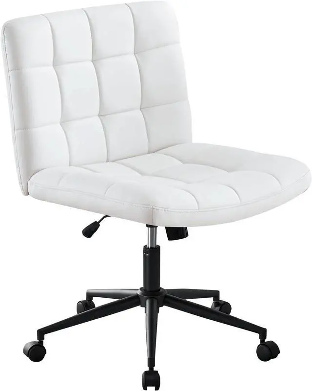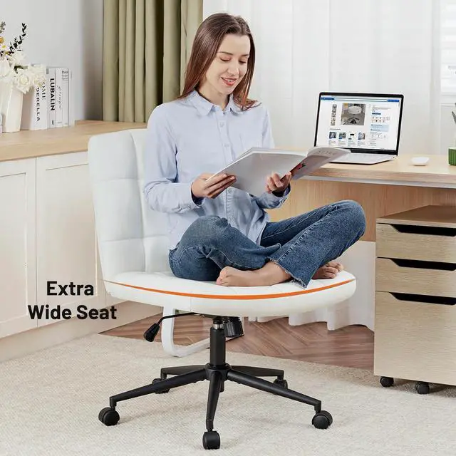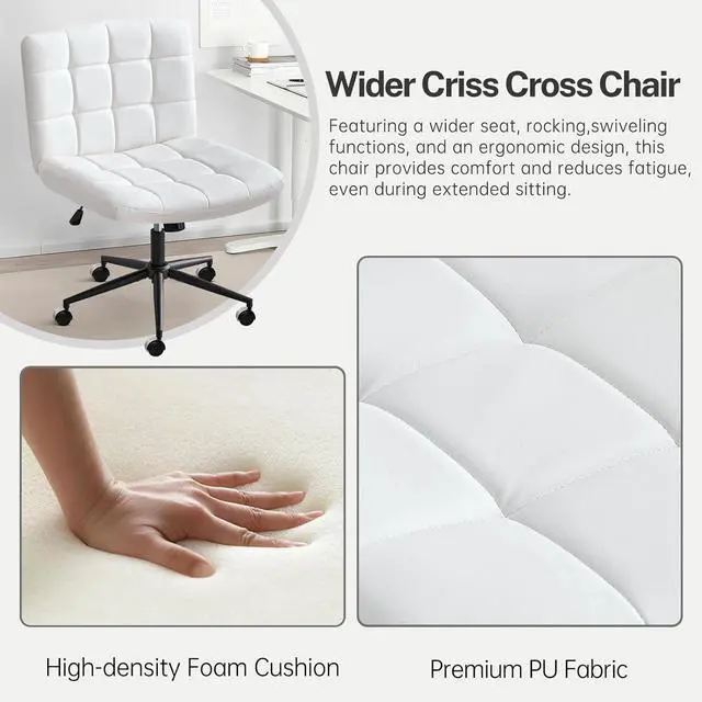 Furniliving Home Office Desk Chair with Wheels,Criss Cross Legged Wide Chair Armless Height Adjustable Chair with Mid Back PU-Padded Swivel Accent Vanity Chairs,IvoryWhite