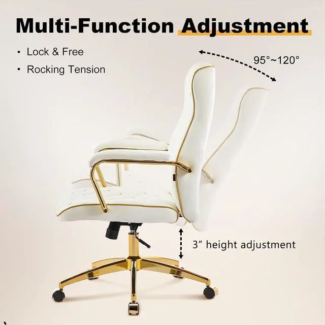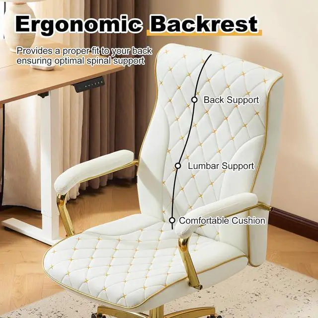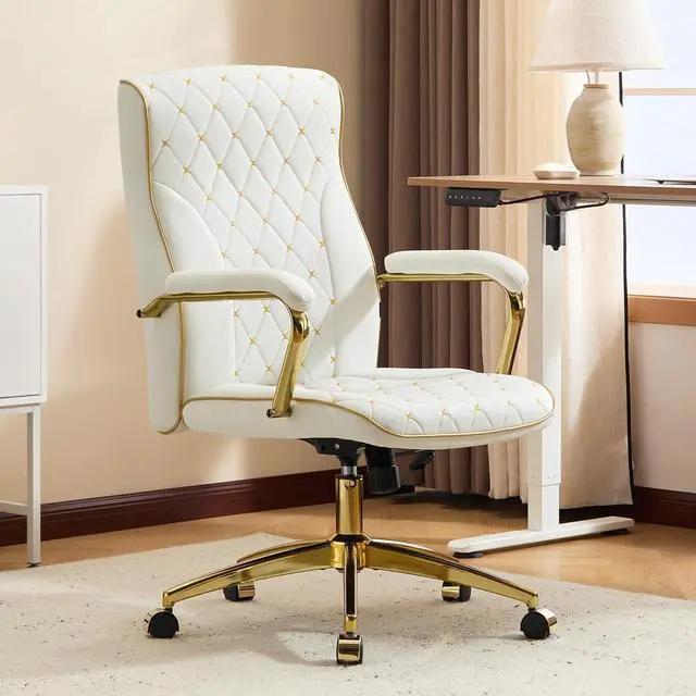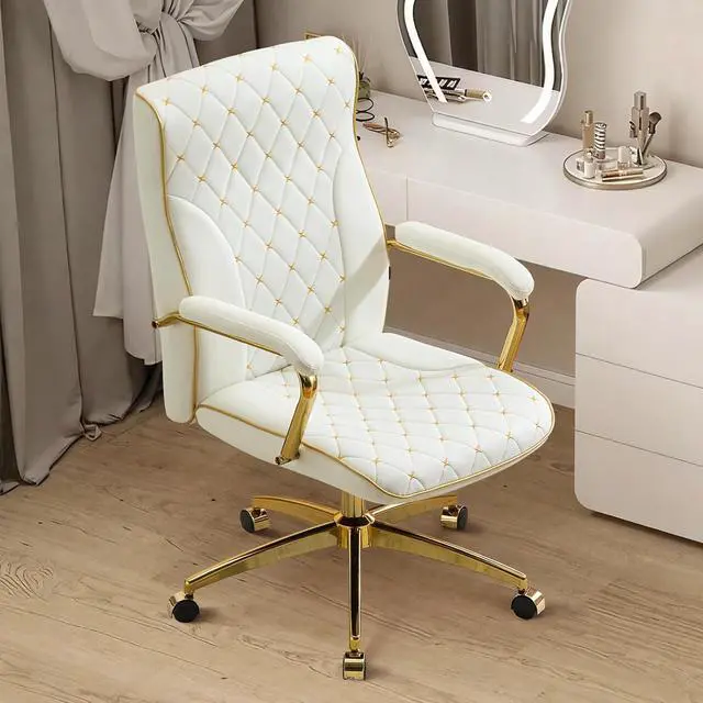 Furniliving White and Gold Office Chair, Leather Office Chairs, Adjustable Vanity Chair with Golden Legs and Padded Armrest, Modern Upholstered Computer Chair with Wheels,White