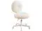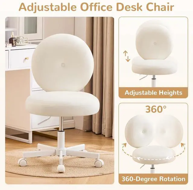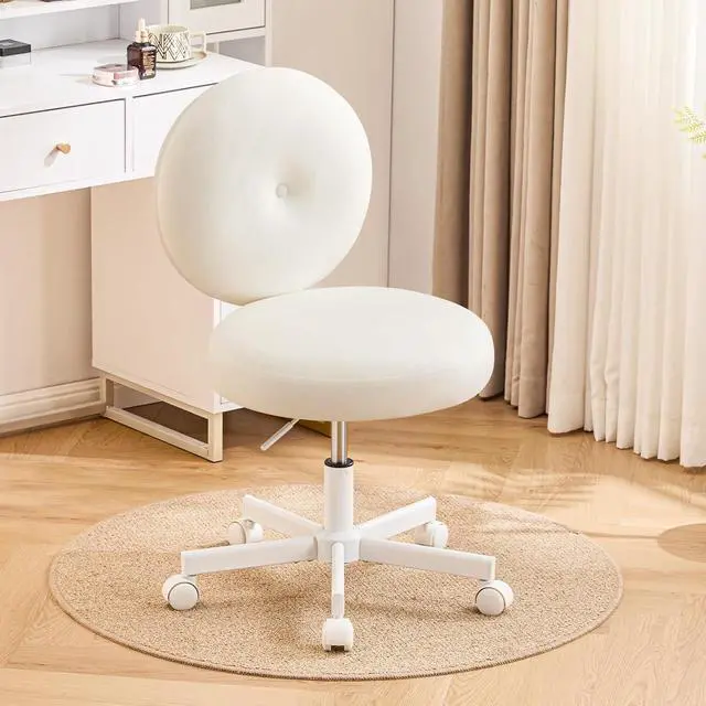 Furniliving Round Armless Desk Chair, Small Upholstered Velvet Vanity Chair with Wheels, Adjustable Swivel Task Rolling Stool Chair for Bedroom, Study Room, White