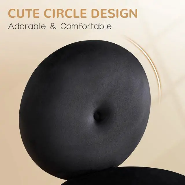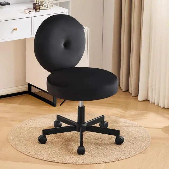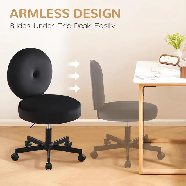 Furniliving Round Armless Desk Chair, Small Upholstered Velvet Vanity Chair with Wheels, Adjustable Swivel Task Rolling Stool Chair for Bedroom, Study Room, Black