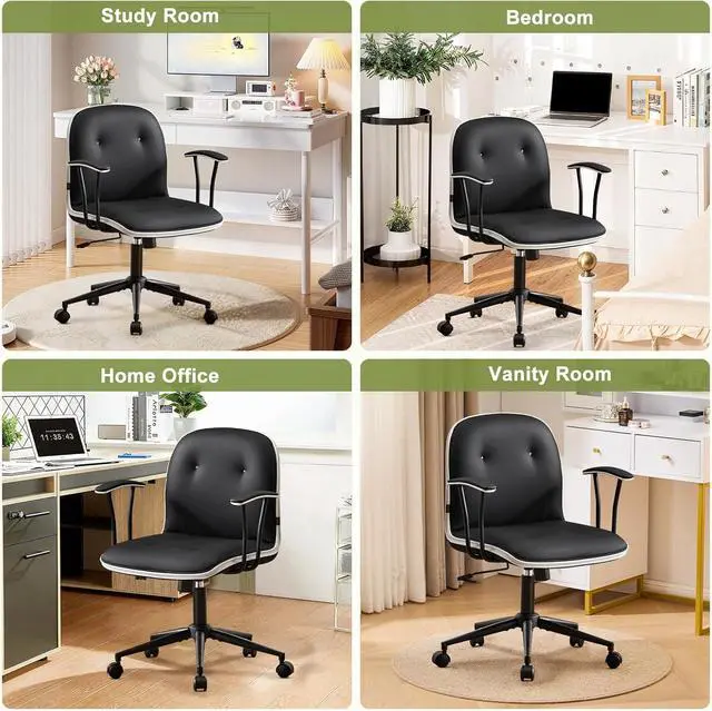 Furniliving Home Office Desk Chair, Modern PU Leather Vanity Chair with Removable & Padded Armrests, Adjustable Height Rolling Swivel Task Chair with Silent Wheels, Black