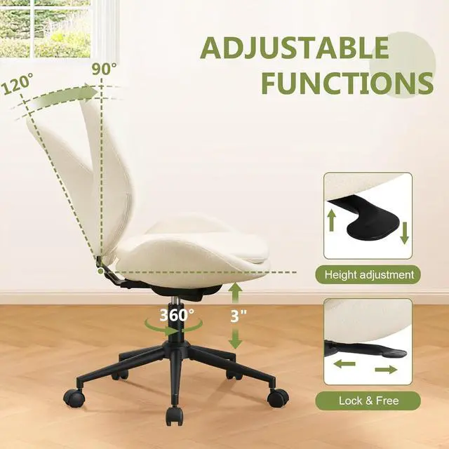 Furniliving Chenille Armless Desk Chair with Wheels, Upholstered Home Office Chair with Double-Layer Cushion, Adjustable Swivel Computer Vanity Chair with Rocking Back, White