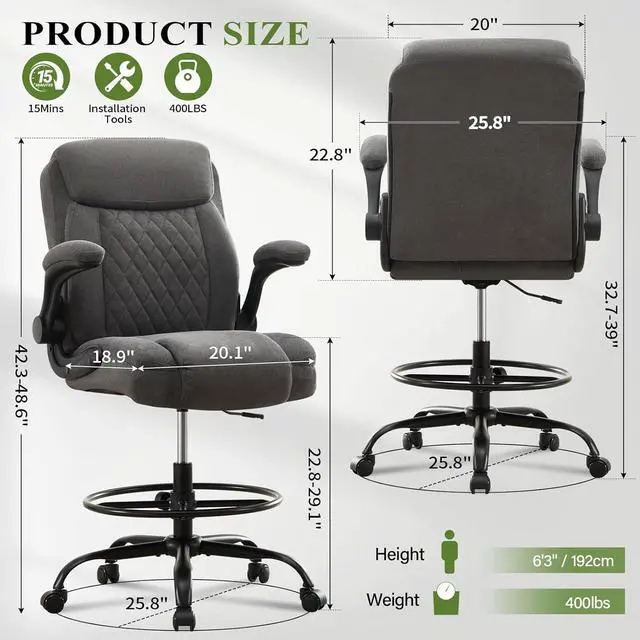 Built to withstand daily use, this tall drafting chair features a robust frame and durable fabric. The smooth-rolling casters offer easy mobility, while the reliable base ensures stability. This tall office chair for standing desk is a perfect fit for any workspace, whether home or office.