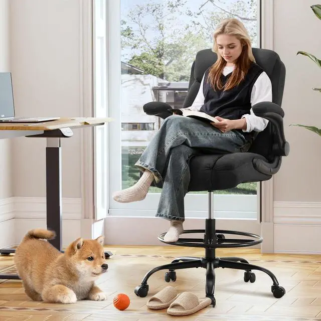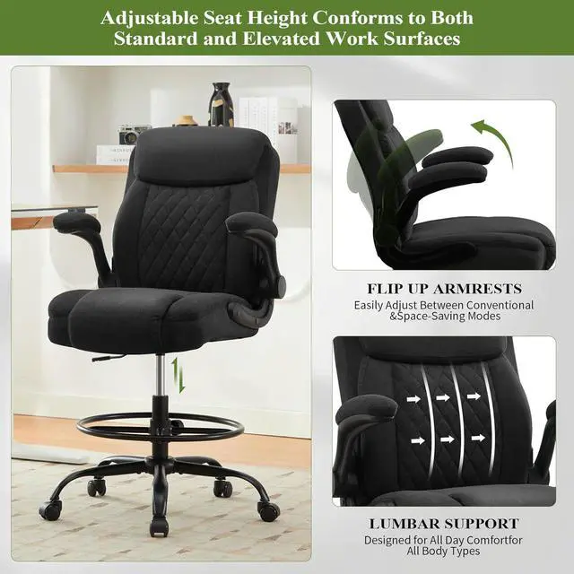 Enjoy all-day comfort with this tall office chair for standing desk. The plush fabric seat provides lasting support, while the lumbar support helps maintain proper posture and reduces strain. Whether youre at home or in the office, this drafting chair tall office chair for standing desk is designed to keep you comfortable and productive.